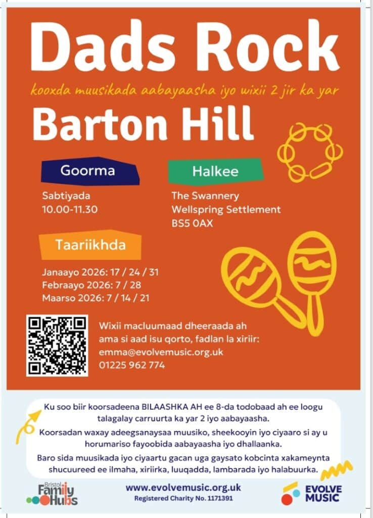 For more information and to book a free place, contact emma@evolvemusic.org.uk or call 01225 962 774. Full details including all session dates can be found on the attached flyers, which are available in English and Somali.